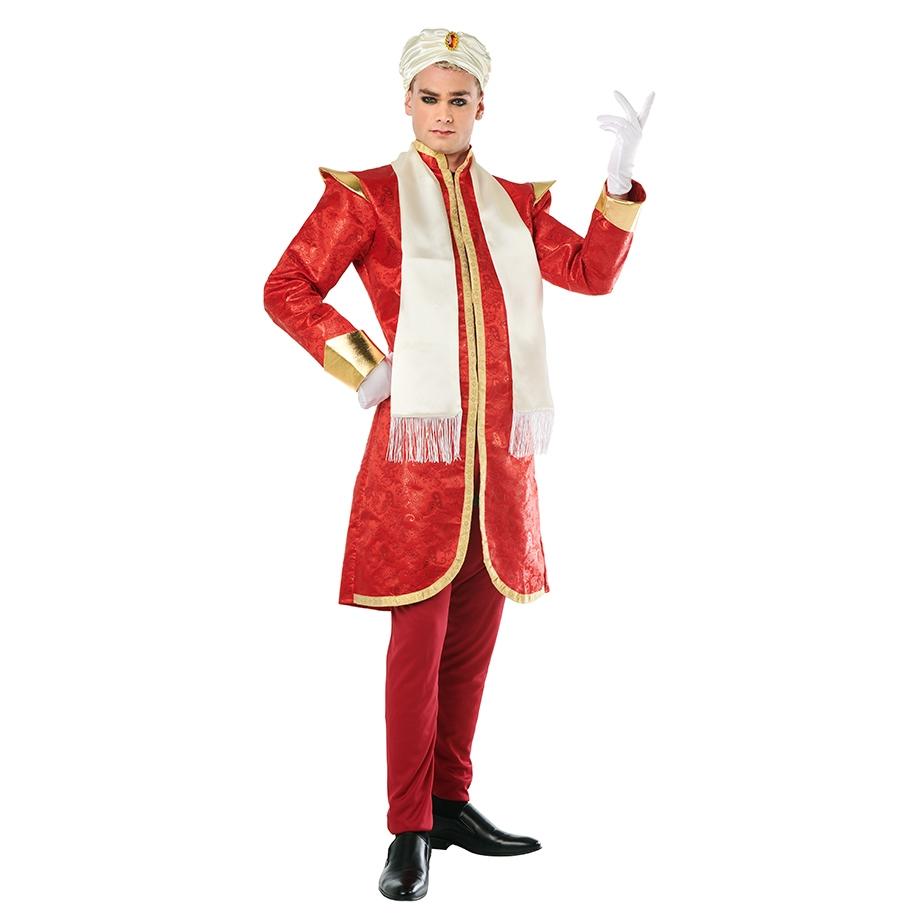 Fato tradicional vermelho com detalhes dourados e lenço branco para homem