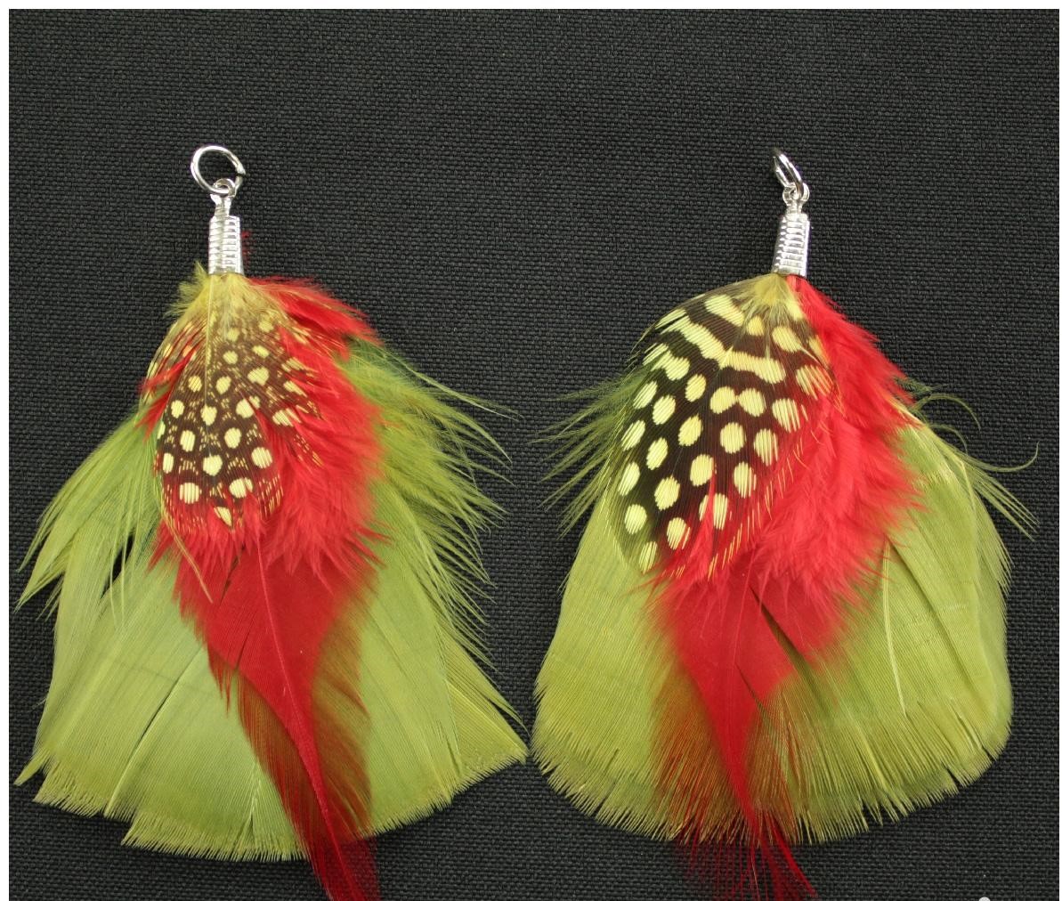 Brincos com penas coloridas em fundo preto