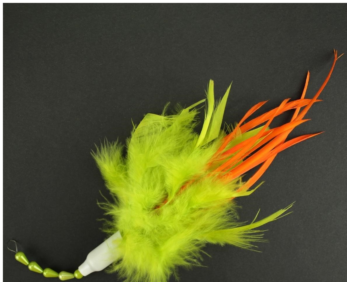 Isca artificial para pesca com penas amarelo-esverdeadas e laranja sobre fundo preto.