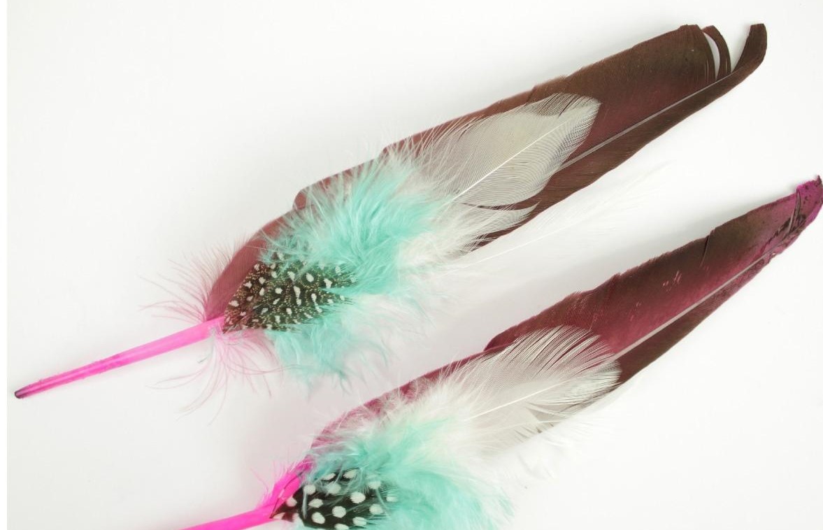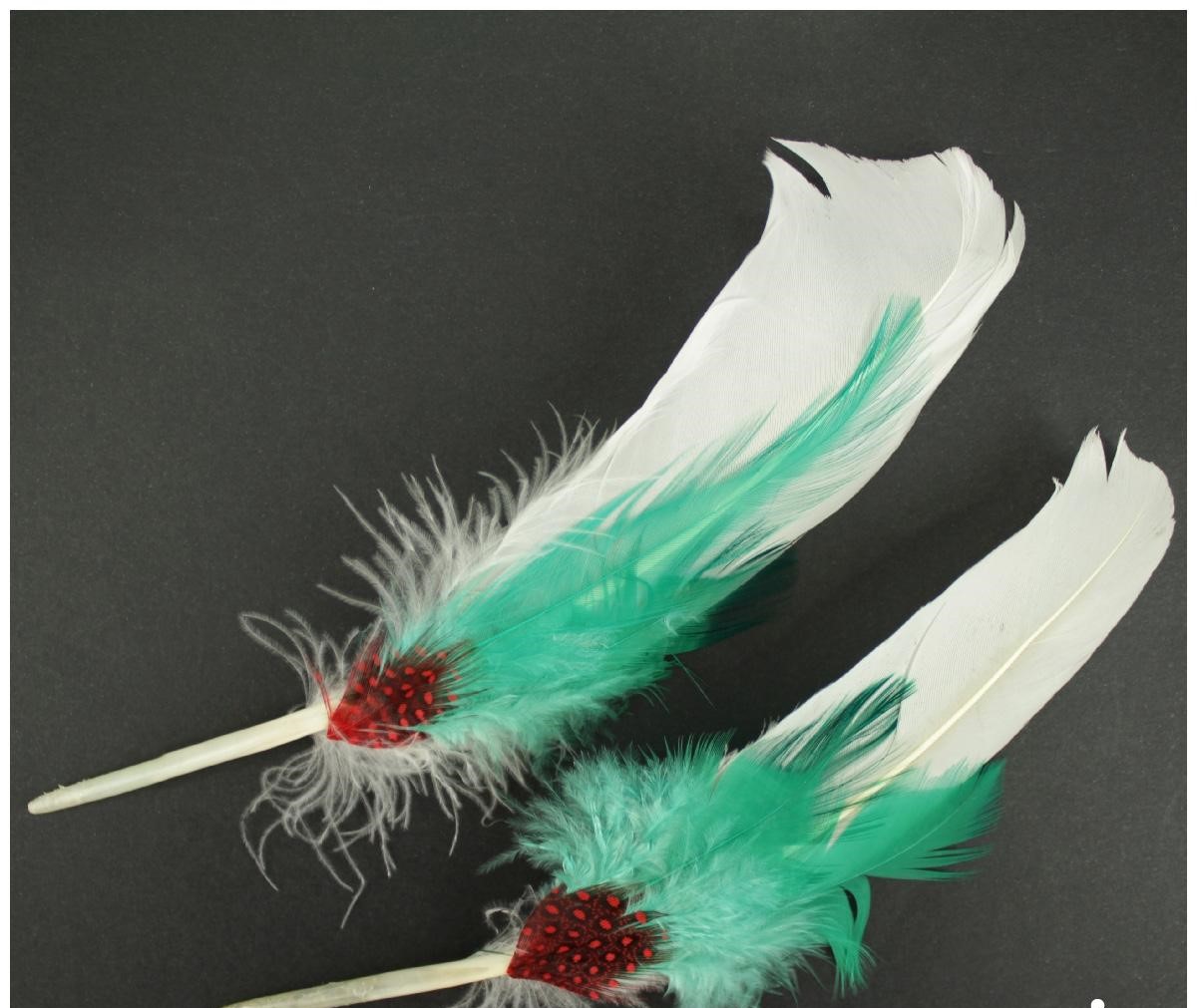 Dois acessórios com penas brancas e verdes com detalhes vermelhos