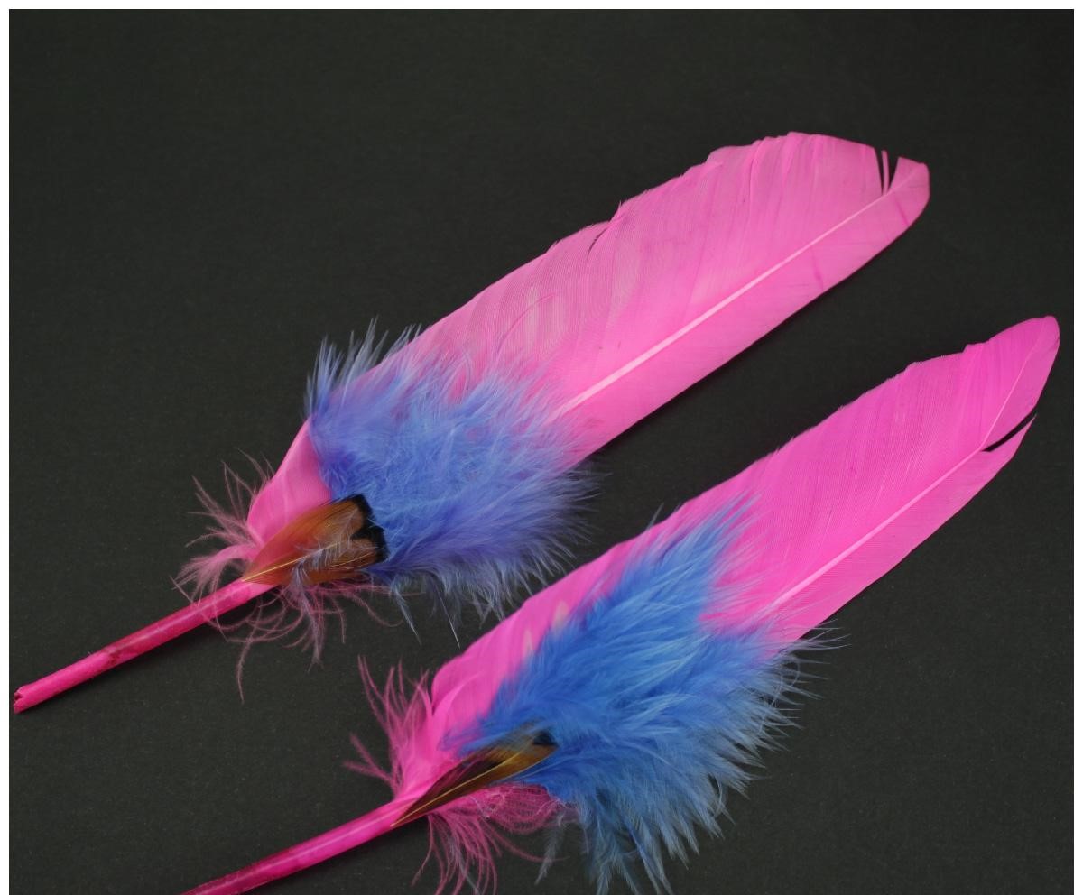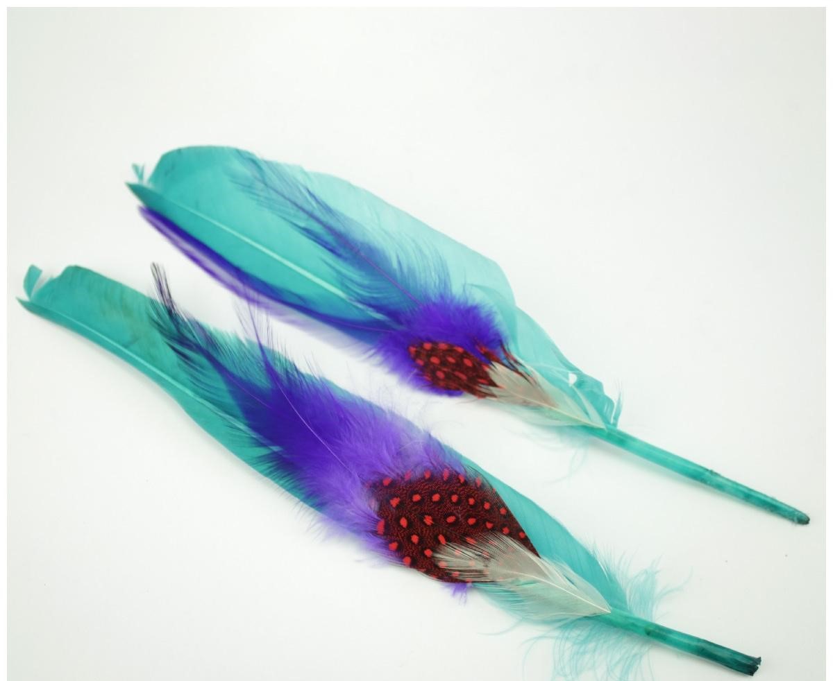 Duas penas decorativas azuis e roxas com manchas vermelhas sobre fundo branco