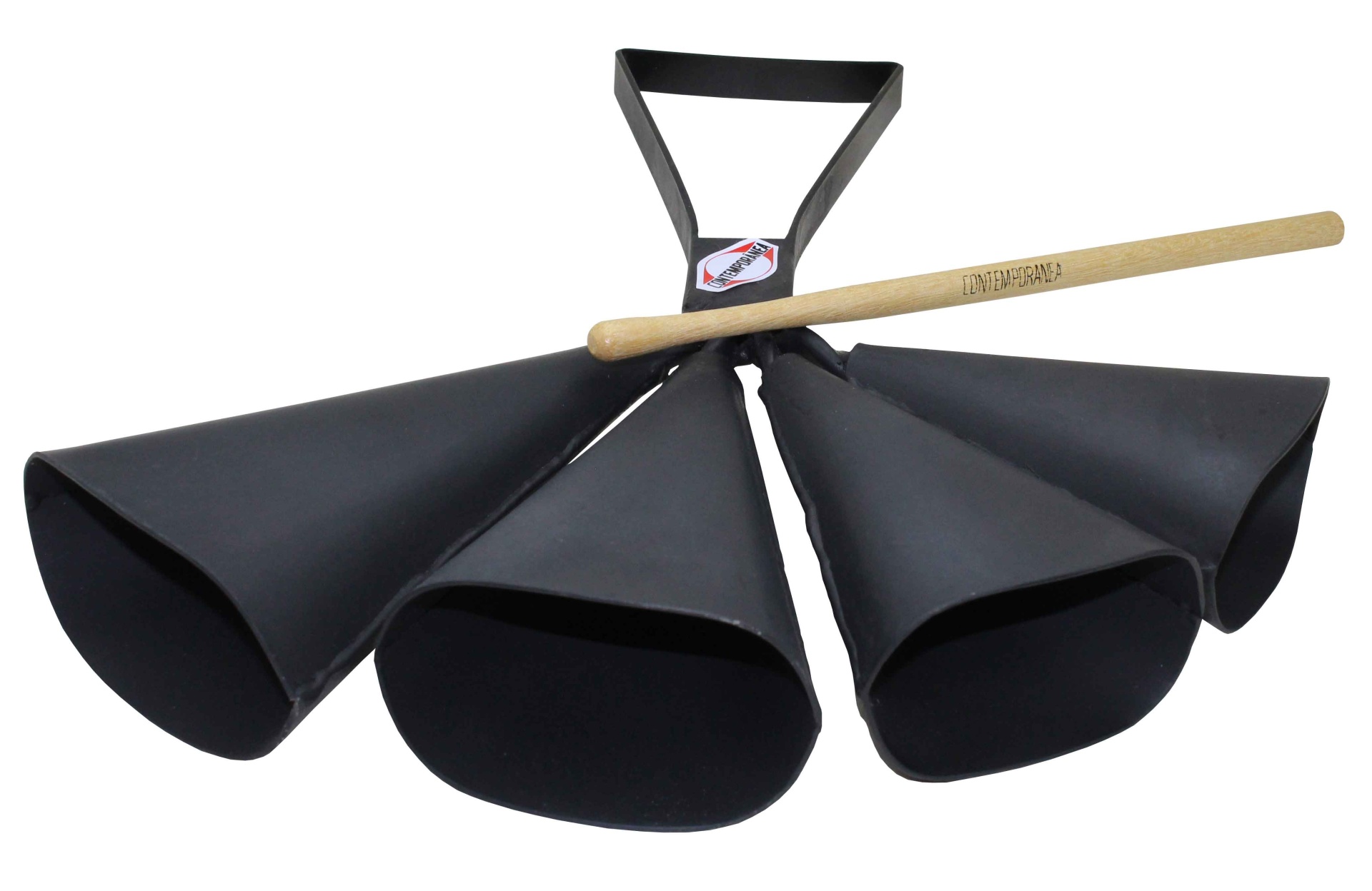 Conjunto de quatro chocalhos pretos cónicos com cabo de madeira e pega preta