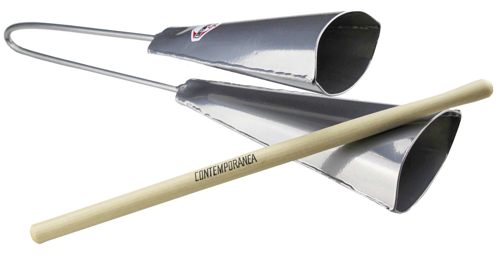 Agogôs prateados com baqueta de madeira clara e fundo branco
