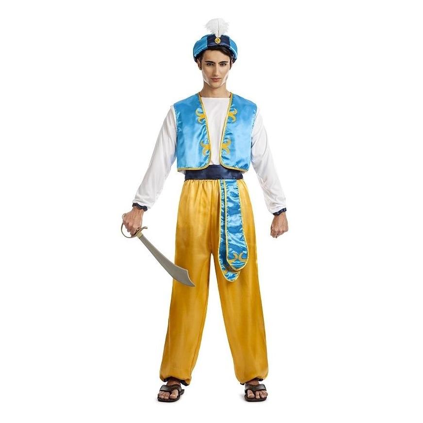 Homem com fato de Aladino azul e amarelo segurando espada curva