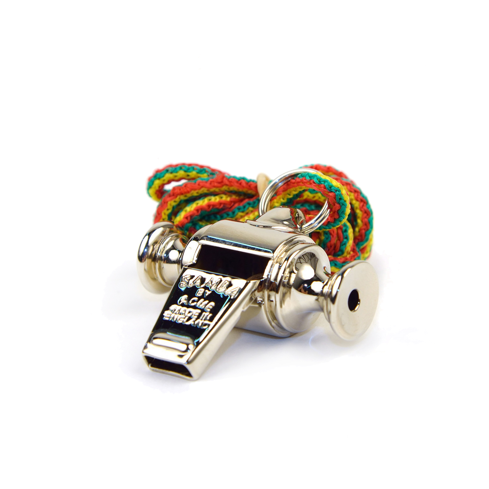 Apito metálico prateado com cordão colorido tricolor sobre fundo branco