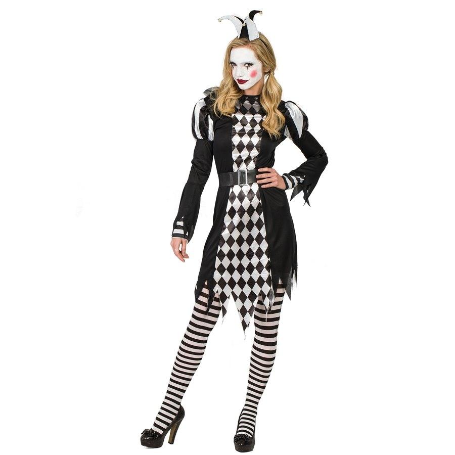 Fato de carnaval preto e branco com padrões de losangos e riscas, usado com diadema de orelhas