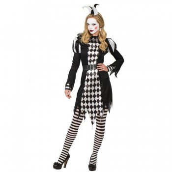 Fato de palhaço preto e branco com padrão losangos e riscas em modelo feminino.