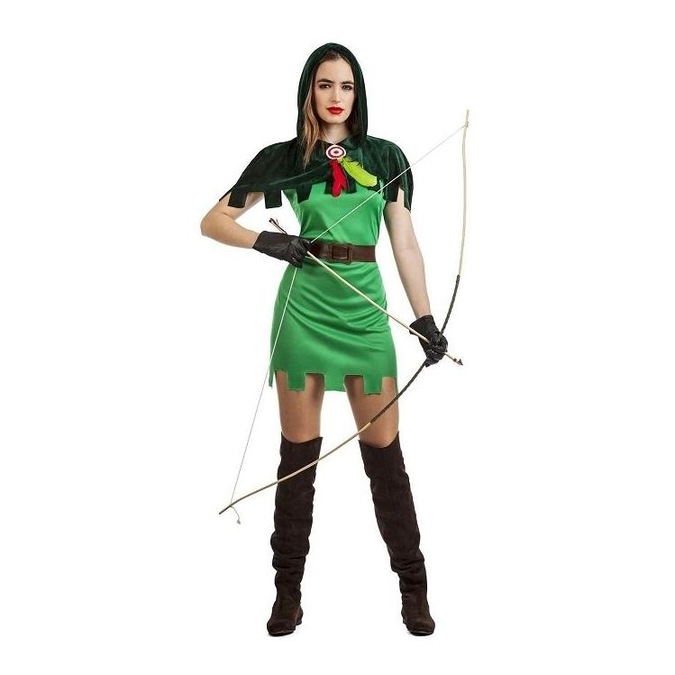 Fato feminino de Robin Hood verde com capa preta, cinto castanho, luvas pretas, botas castanhas e arco com flecha