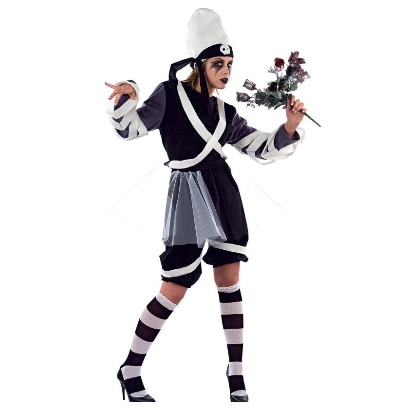 Fato fantasia preto, cinzento e branco com riscas e flores vermelhas