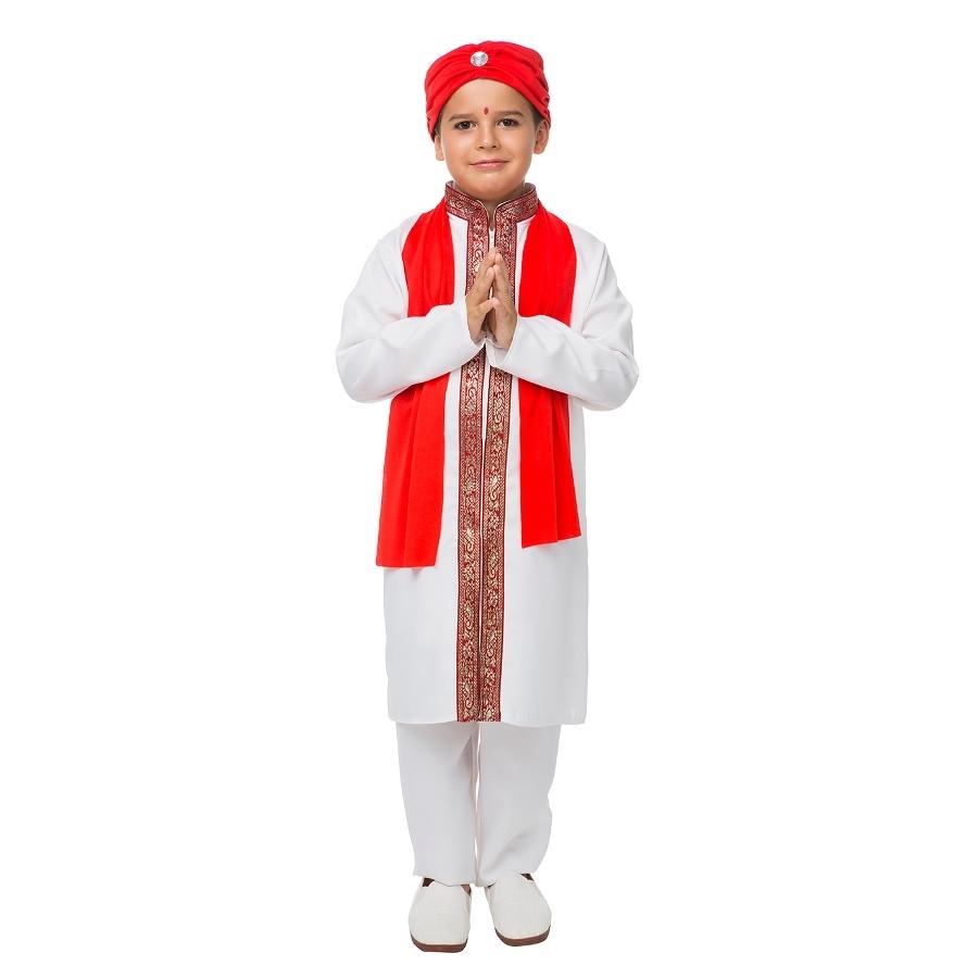 Menino com roupa tradicional branca e vermelha, mãos unidas em saudação