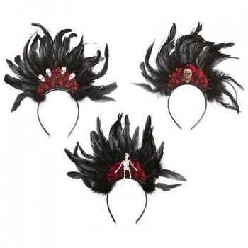Três tiaras decorativas com penas pretas e detalhes de esqueletos sobre fundo branco