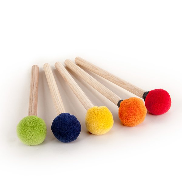 Cinco baquetas com cabeças de feltro coloridas e cabos de madeira clara sobre fundo branco