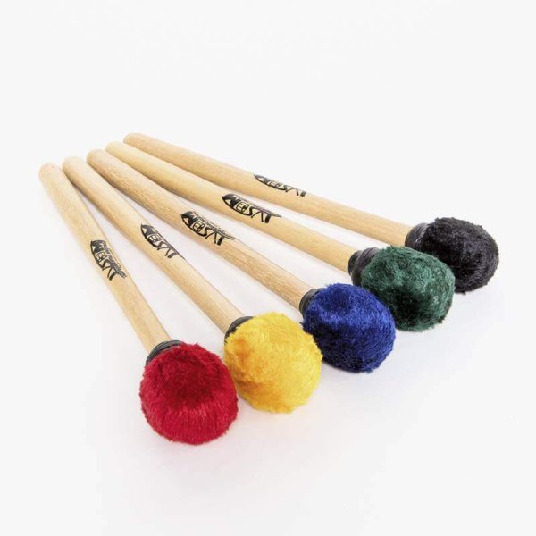 Cinco baquetas de madeira com pontas almofadadas coloridas