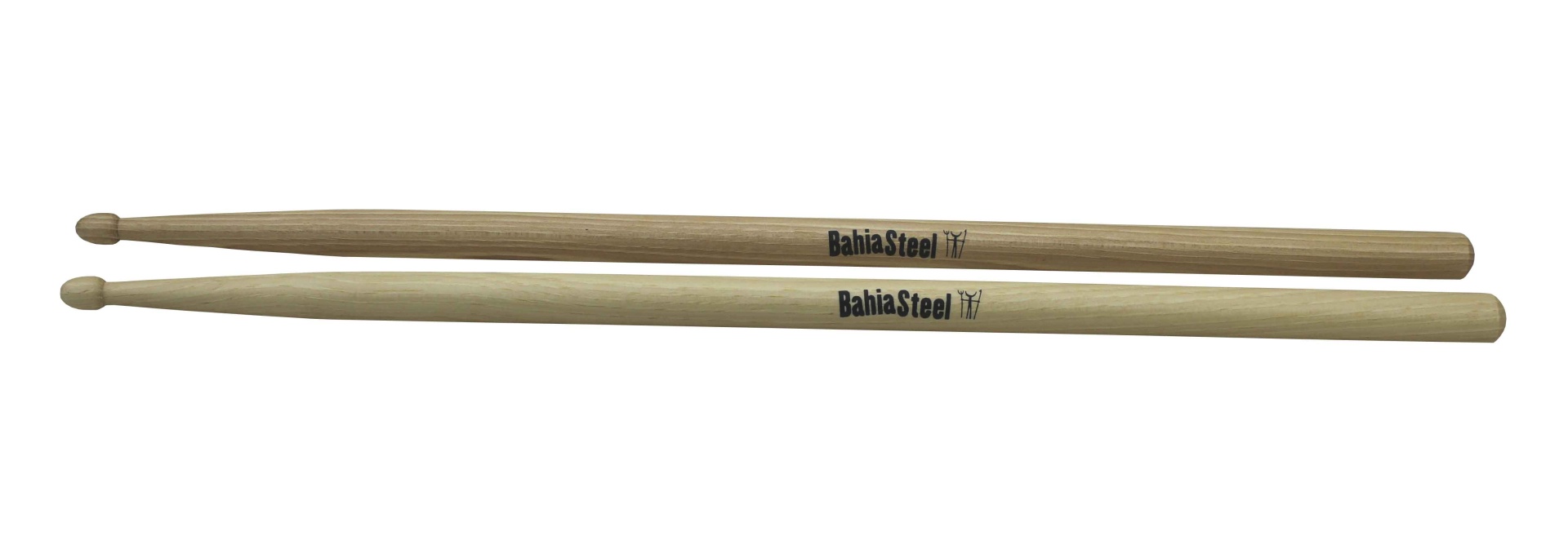 Par de baquetas de madeira clara com texto BahiaSteel