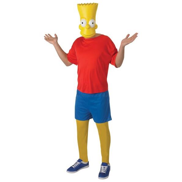 Fato de Carnaval do Bart Simpson com máscara, t-shirt vermelha, calções azuis, meias amarelas e ténis azuis