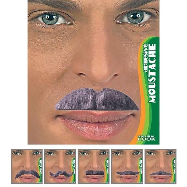 Bigodes adesivos cinzentos em rosto de homem com embalagem visível