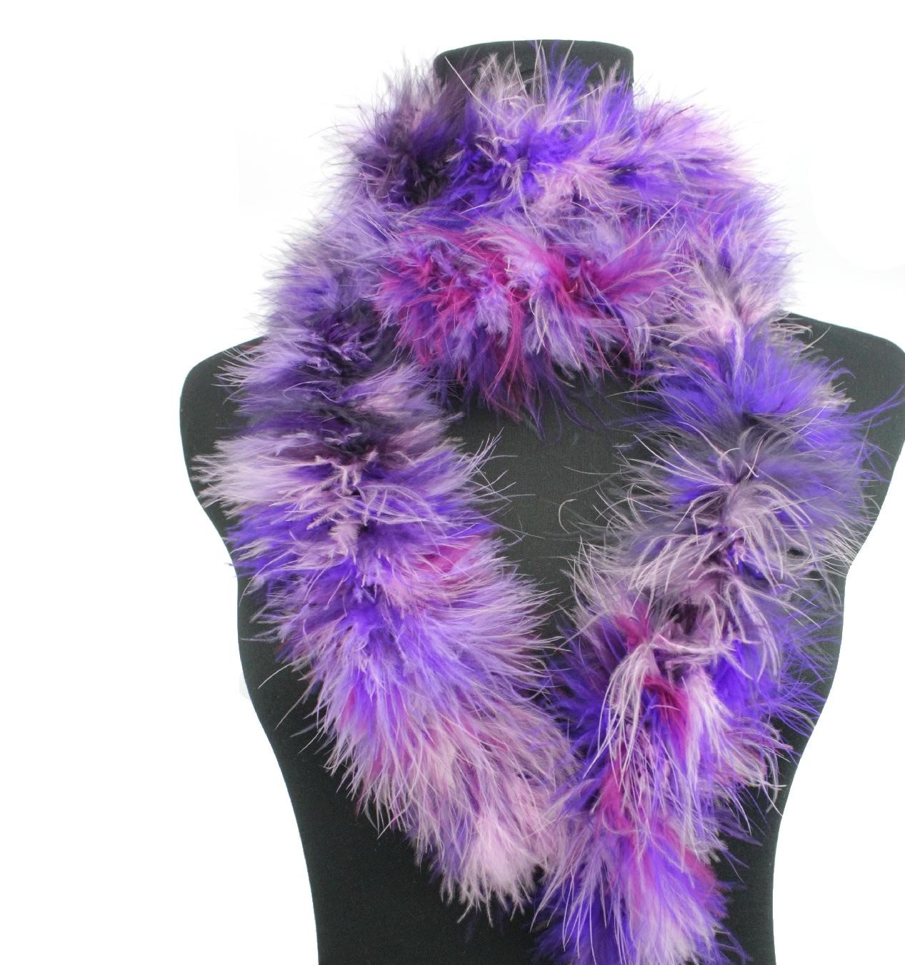 Cachecol estilo plumas em tons de roxo e lilás em manequim preto