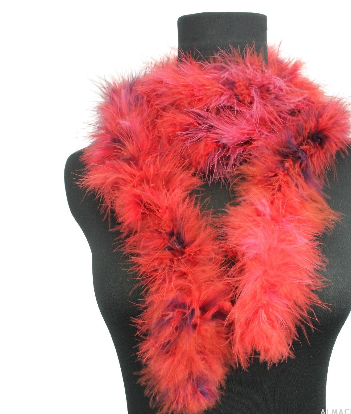 Cachecol tipo pluma vermelho e rosa em manequim preto