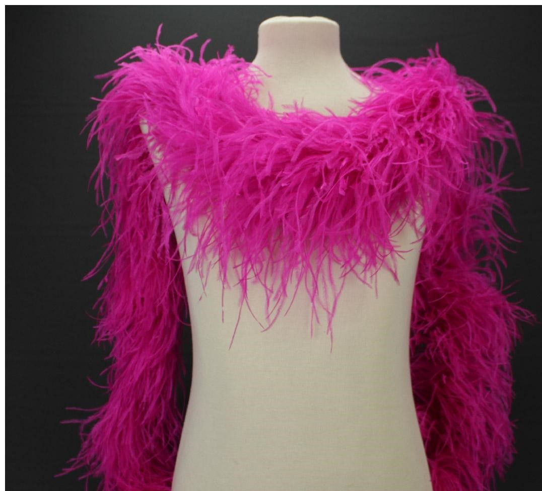 Pena rosa fúcsia em manequim branco com fundo preto.