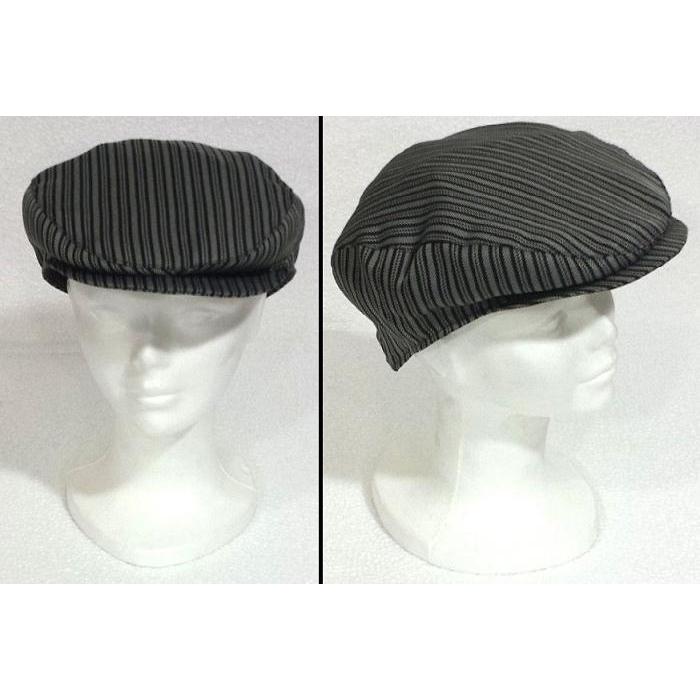 Boné riscado preto e cinzento em manequim branco, frontal e lateral
