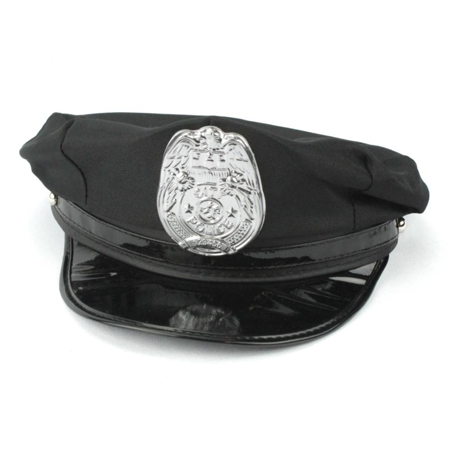Chapéu de polícia preto com emblema prateado e aba brilhante