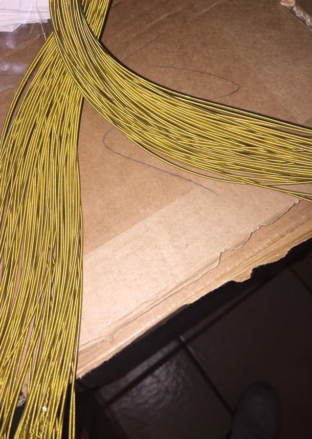 Fios dourados finos sobre cartão castanho com chão de azulejos ao fundo