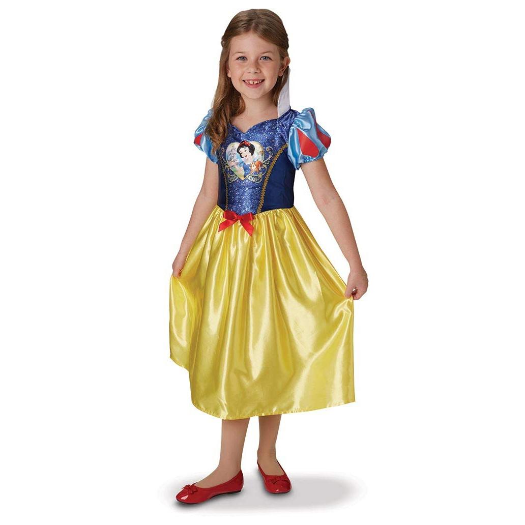 Vestido de fantasia infantil azul e amarelo com princesa estampada, menina com sapatos vermelhos