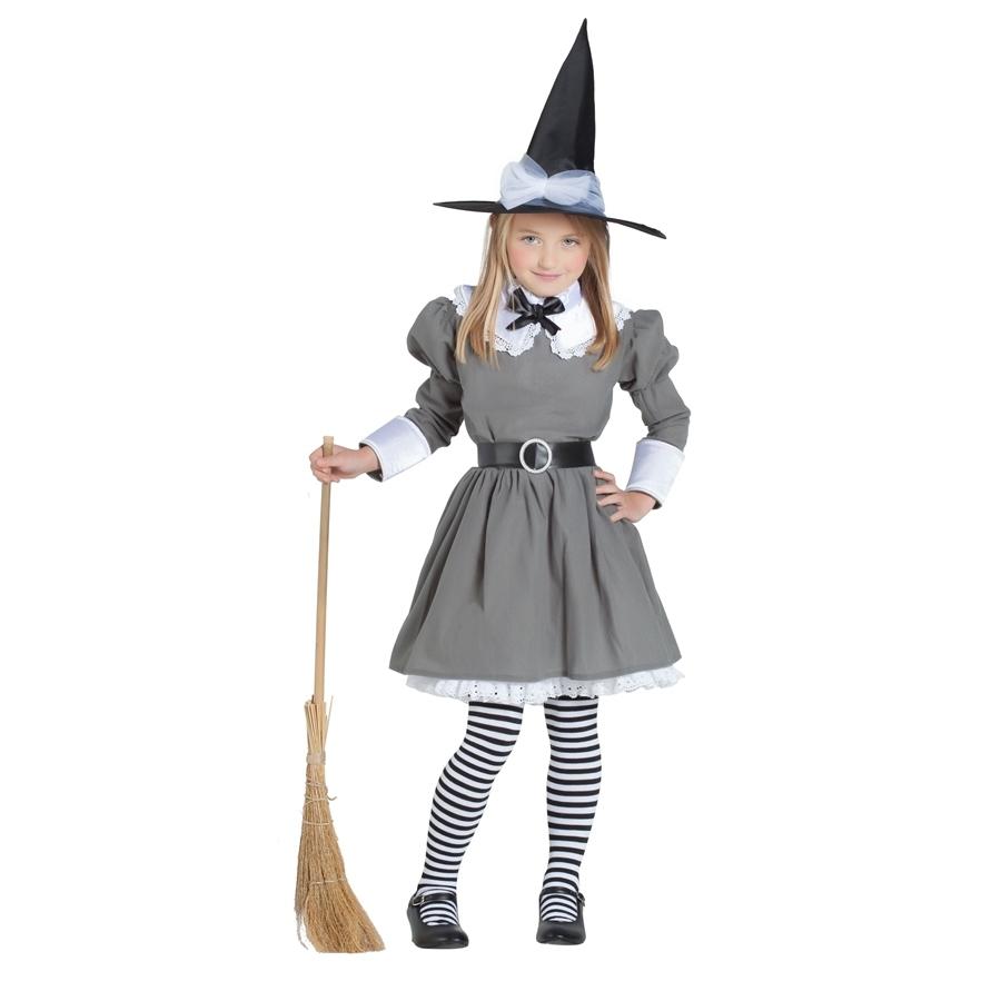Fato de bruxa cinzento com gola branca e chapéu preto