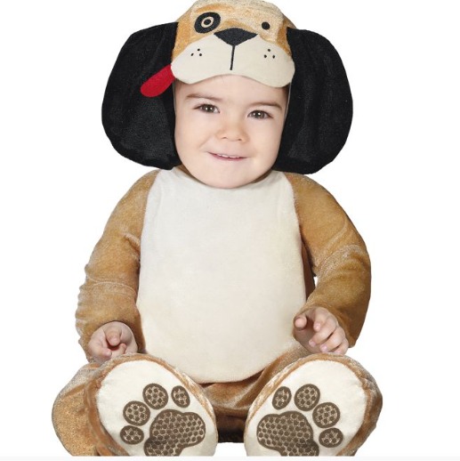 Fato de bebé em forma de cão com capuz e patas desenhadas nos pés