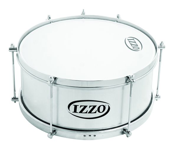 Tambor prateado com pele branca e logotipo IZZO