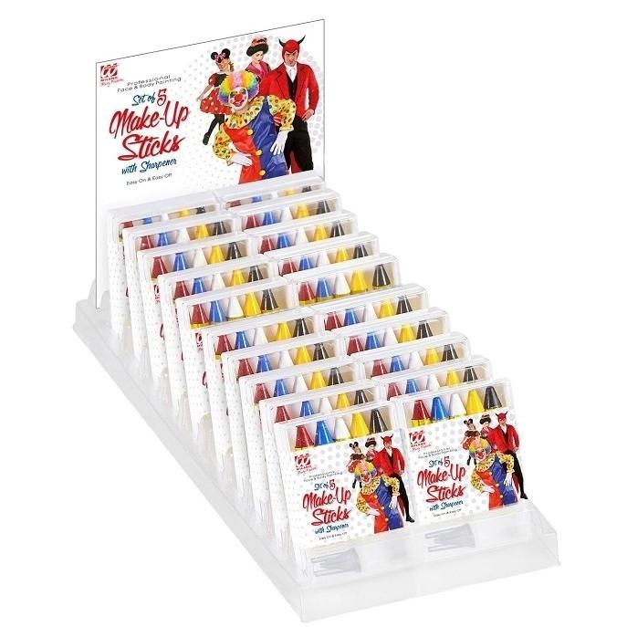 Expositor com vários conjuntos de lápis de maquilhagem coloridos e aplicadores em embalagem ilustrada