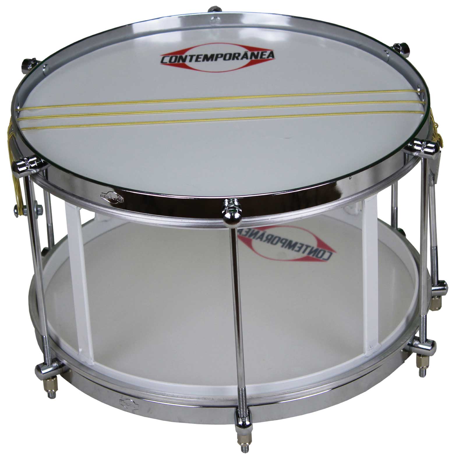 Tambor prata com pele branca e texto CONTEMPORANEA