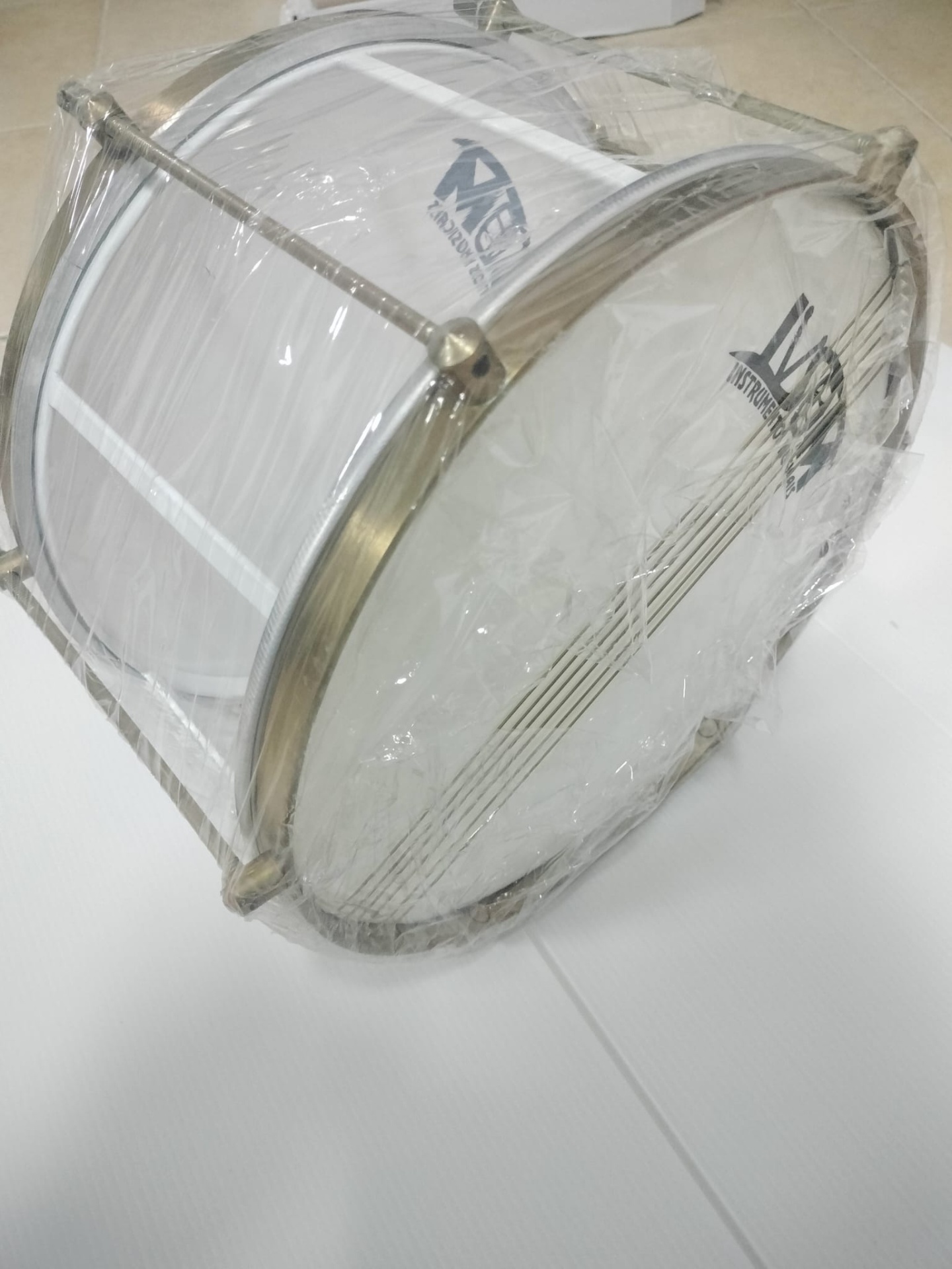 Tambor branco com aro metálico e plástico protetor