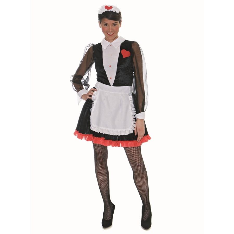 Fato de empregada preto com avental branco e detalhes vermelhos
