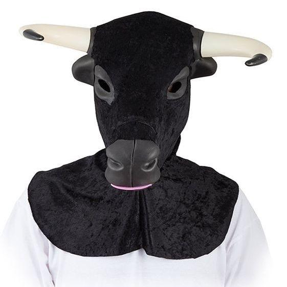 Máscara de touro preta com chifres brancos e detalhes em preto, usada por pessoa com camisa branca