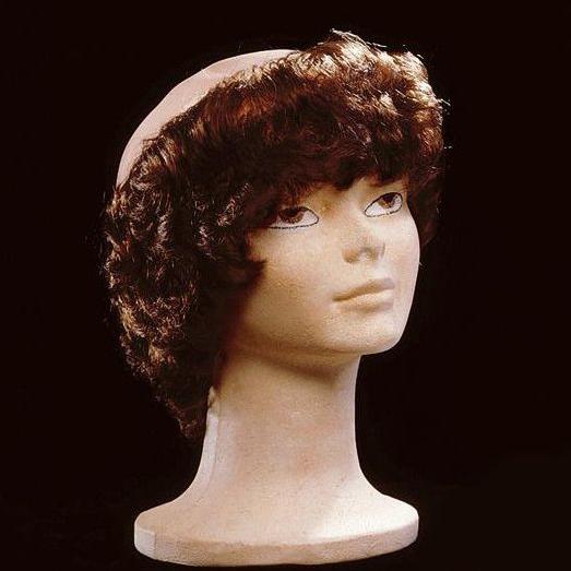 Cabeça mannequin com peruca castanha encaracolada em fundo preto