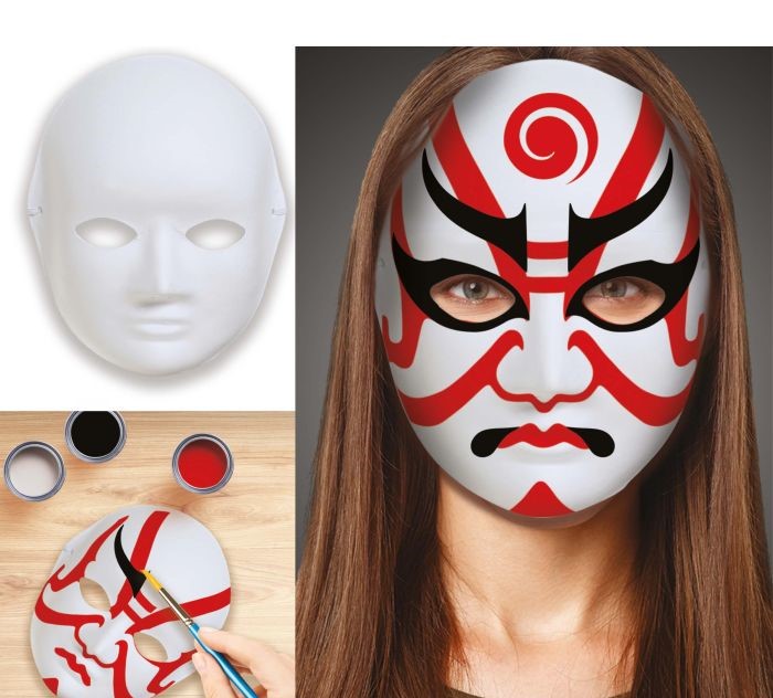 Máscara branca decorada com pinturas vermelha e preta, pincéis e tintas visíveis