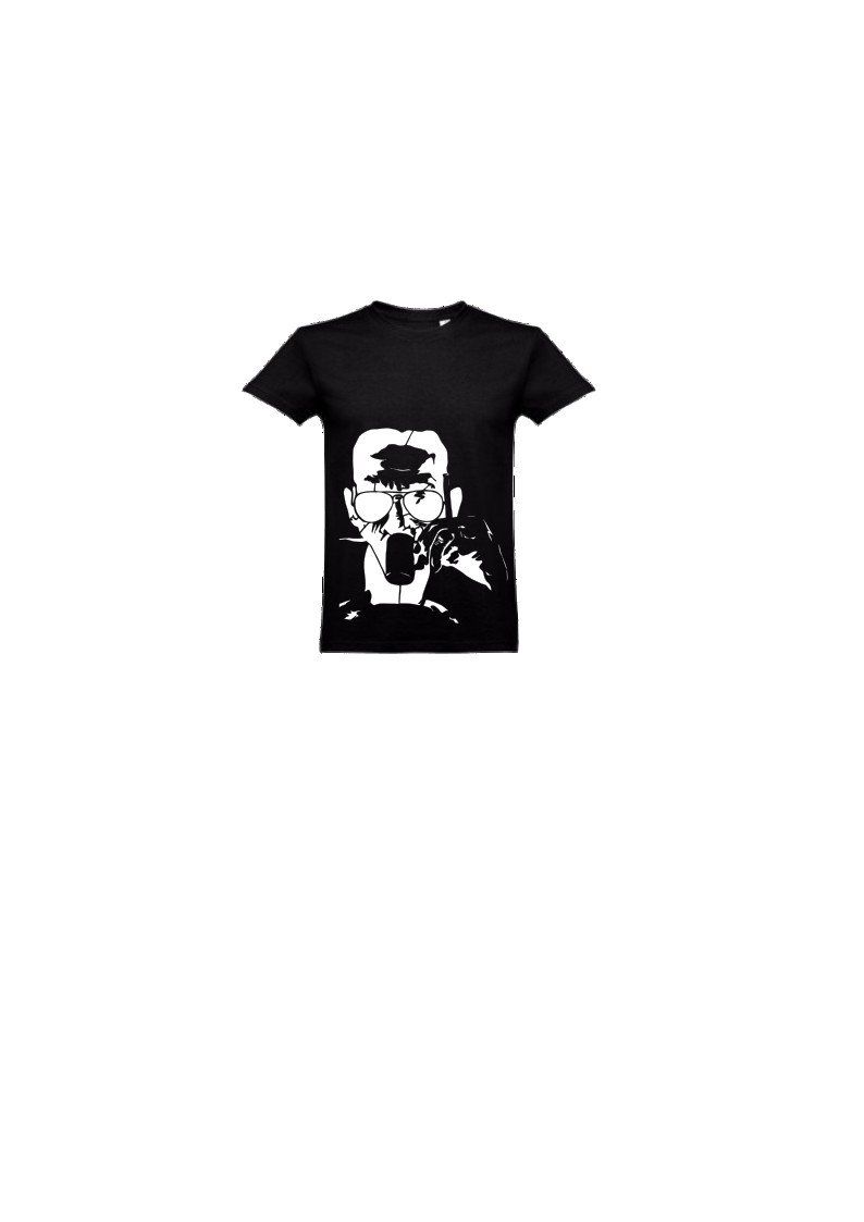 T-shirt preta com estampa de rosto branco segurando um objeto circular