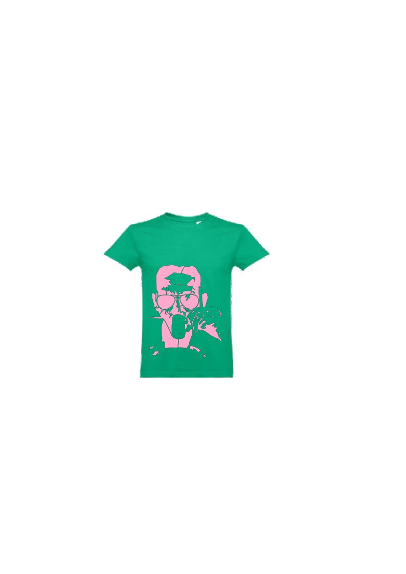 T-shirt verde com estampa rosa de rosto com óculos e aparelho respiratório
