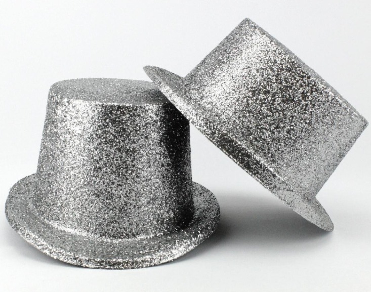 Dois chapéus tipo cartola prateados com glitter sobre fundo branco