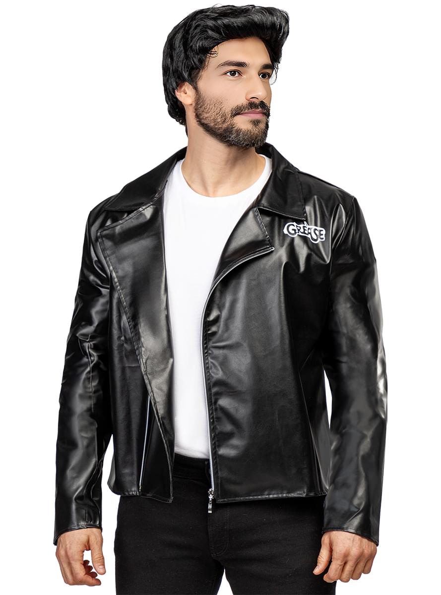 Casaco biker preto com logótipo GREASE no peito, usado por modelo masculino