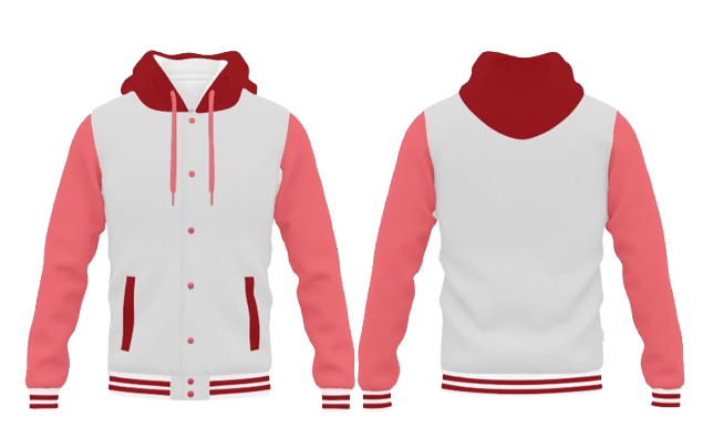 Casaco varsity com capuz vermelho, corpo branco, mangas rosas e detalhes vermelhos