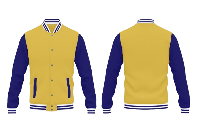 Casaco tipo universitário amarelo com mangas azuis e detalhes às riscas