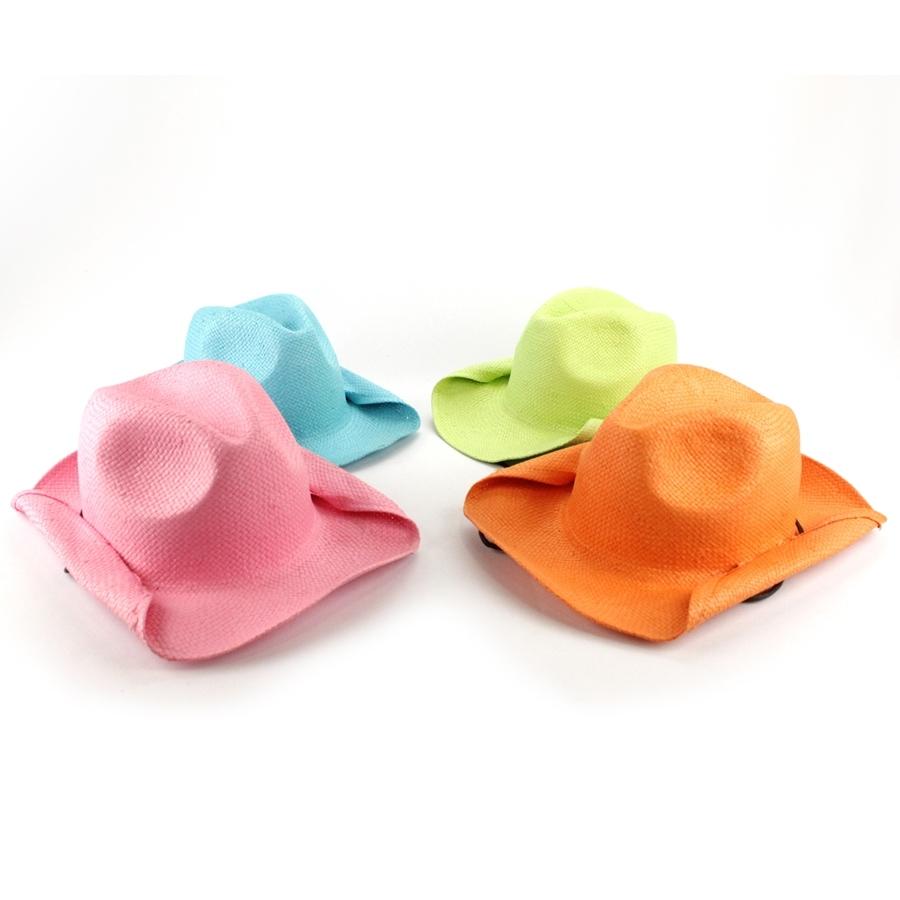 Quatro chapéus de palha coloridos em tons pastel