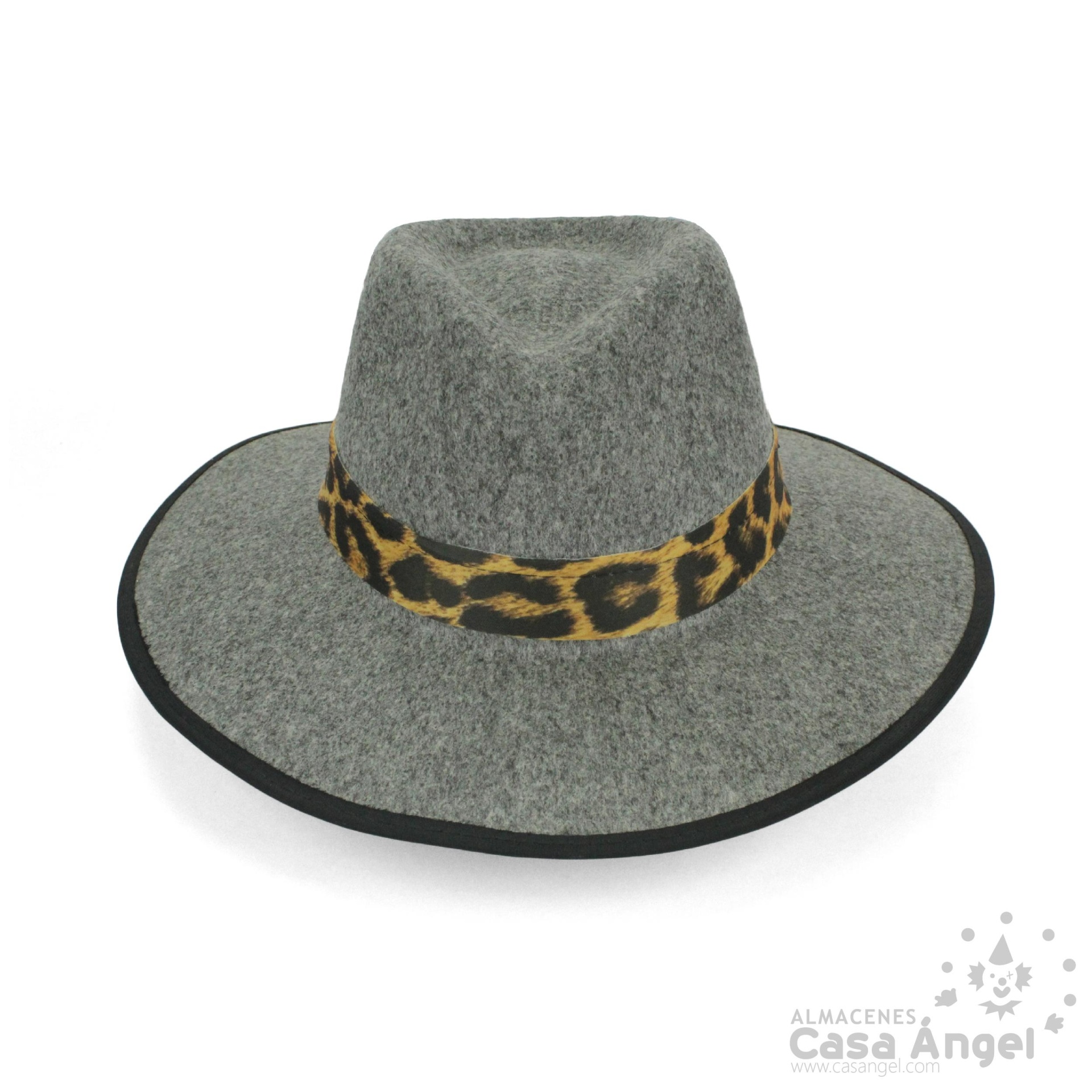 Chapéu cinza de feltro com faixa animal print e aba larga