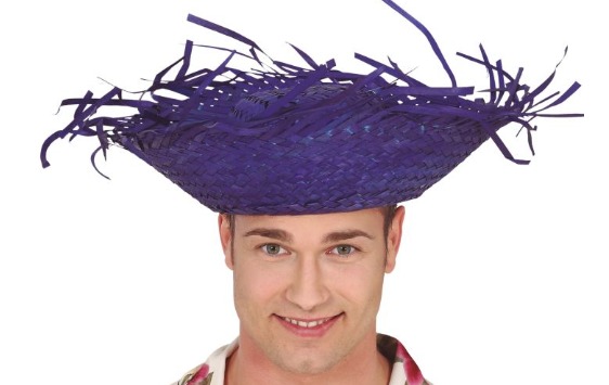 Chapéu de palha roxo com franjas irregulares usado por um homem