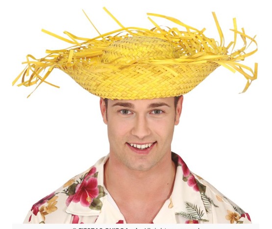 Homem com chapéu amarelo de palha e camisa florida