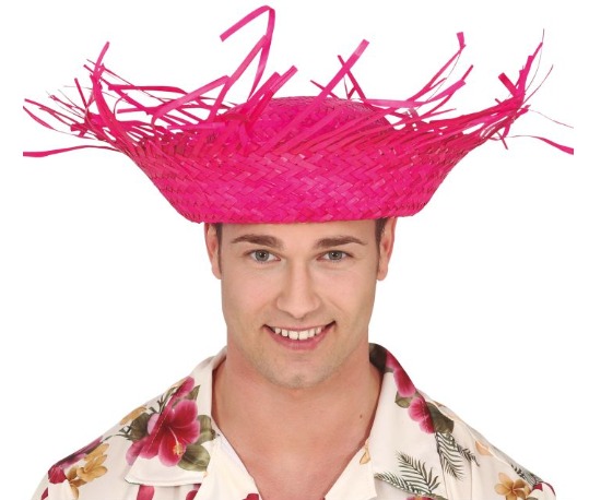 Homem com chapéu rosa trançado e camisa de flores tropicais