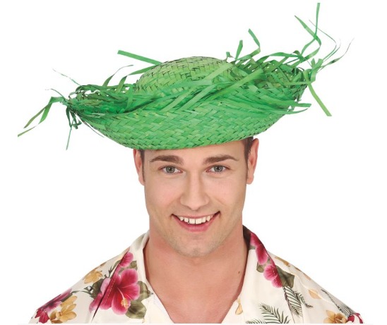 Homem com chapéu de palha verde e camisa florida