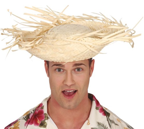 Homem a usar chapéu de palha com franjas e camisa florida